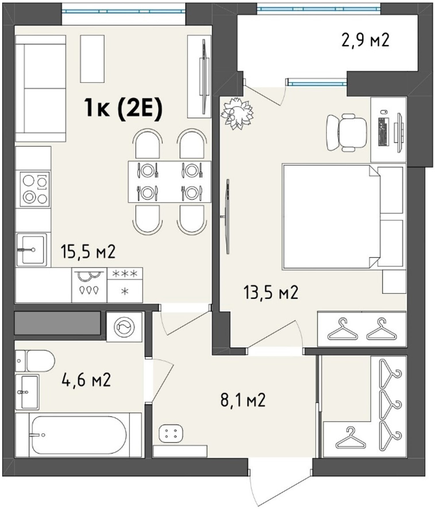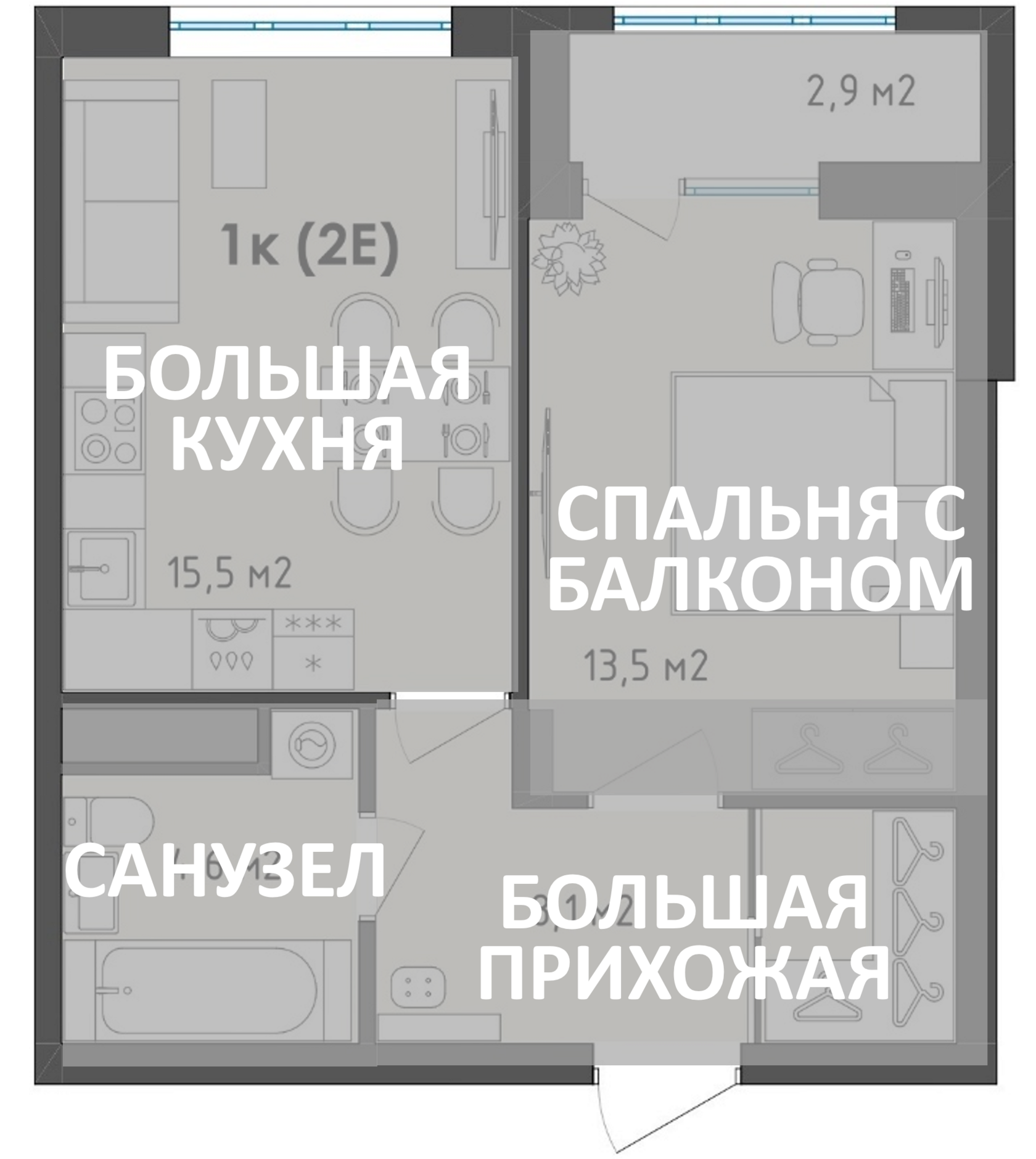 ЕСЛИ ПЕРЕНЕСТИ СТЕНКУ МЕЖДУ САНУЗЛОМ И ПРИХОЖЕЙ, МЫ ПОЛУЧИМ ОБЪЕМНЫЙ ПРОСТОРНЫЙ САНУЗЕЛ, ЧТО ПОЗВОЛИТ РАЗМЕСТИТЬ В НЕМ ОДНОВРЕМЕННО ДУШЕВУЮ, СТИРАЛЬНУЮ И СУШИЛЬНУЮ МАШИНЫ.